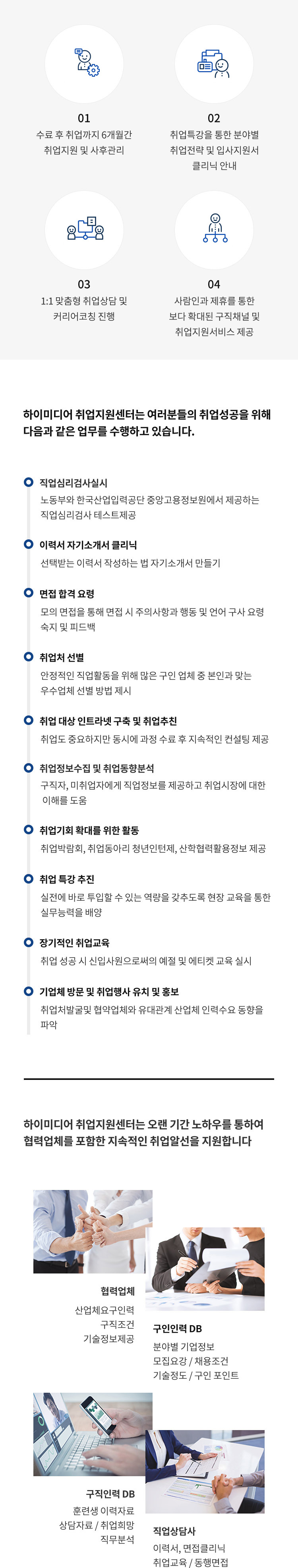 취업을 향한 여러분들의 힘찬 발걸음에 보탬을 드리기 위해 저희 하이미디어에서는 전문 컨설턴트들로 구성된 취업지원센터를 운영하고 있습니다. 여러분들의 성공적인 사회진출을 위하여 최선을 다하겠습니다.